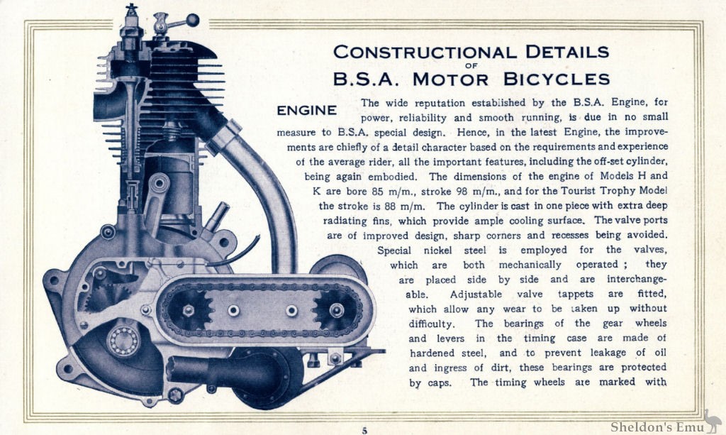 The wide reputation established by the B.S.A. Engine, for power, reliability and smooth running, is due in no small measure to B.S.A, special design. Hence, in the latest Engine, the improvements are chiefly off-set character cased on the requirements and experience of the average rider, all the important features, including the off-set cylinder, being again embodied.
