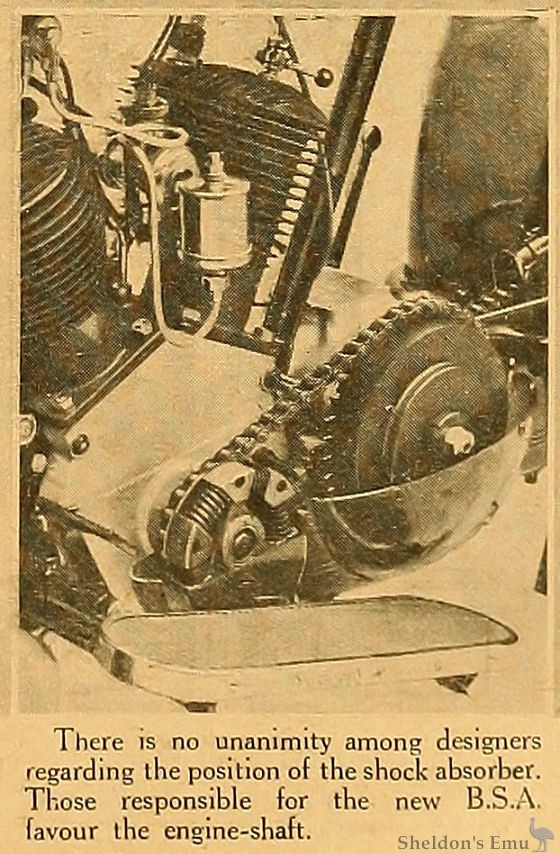 There is no unanimity among designers regarding the position of the shock absorber. Those responsible for the new B.S.A. favour the engine-shaft.