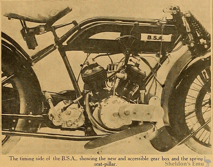 The tank holds over two gallons of fuel and three pints of oil. Sidecar lugs are, of course, incorporated with the frame. With regard to fittings and finish, it is only necessary to remark that these are well up to the B.S.A. standard of excellence.