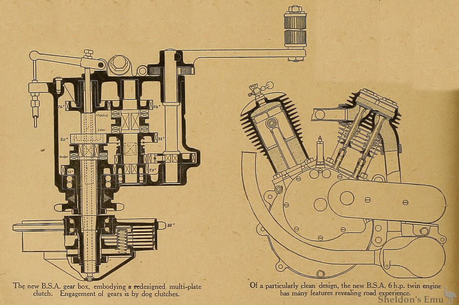 (L.) The new B.S.A. gear box, embodying s redesigned multi-plate clutch. Engagement of gears is by dog clutches. (R.) Of a particularly clean design, the new B.S.A. 6 h.p. twin engine has many features revealing road experience.