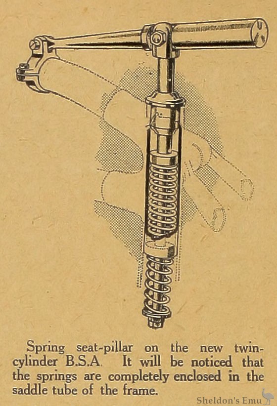Spring seat-pilar on the new twin-cylinder B.S.A. It will be noticed that the springs are completely enclosed in the saddle tube of the frame.