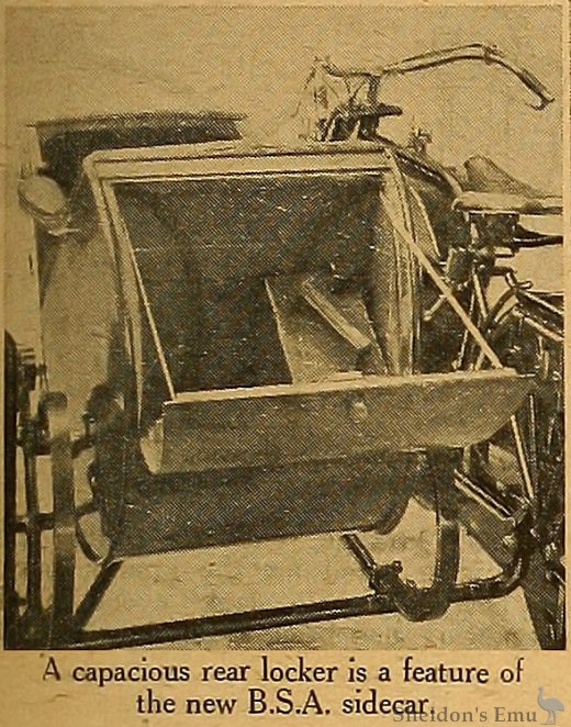 A capacious rear locker is a feature of the new B.S.A. sidecar.