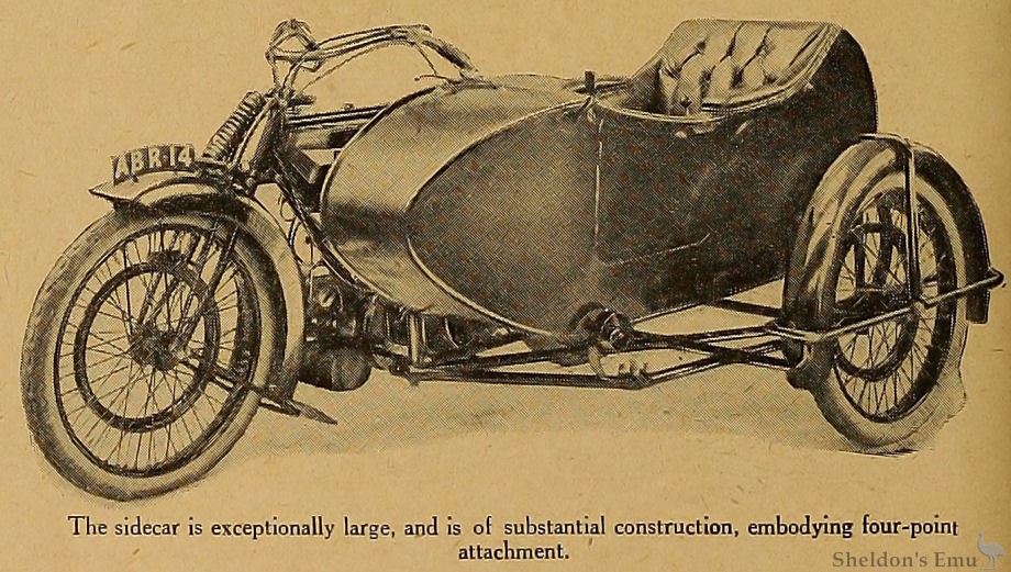 A special sidecar has been constructed to suit the machine; the lines are pleasing, and the body is particularly roomy and well sprung, leaf springs being fitted in front as well as at the rear. Four points of attachment are provided.