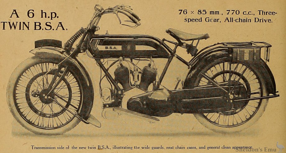 Transmission is by 5/8 in. x 3/8 in. chain throughout, the B.S.A. cush drive being incorporated with the engine sprocket, and an internal expanding brake with the rear driven sprocket.
