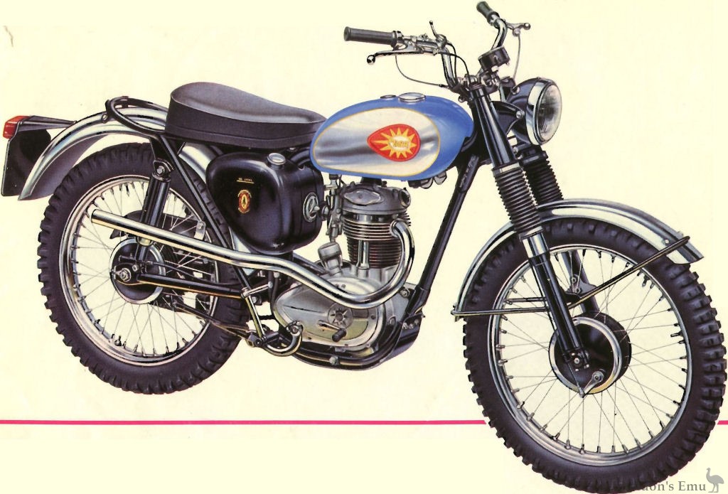Equipment:Western type handlebars, scrambles dualseat, scrambles footrests, ball-end clutch and front brake levers, 90 m.p.h. speedometer, skid plate under engine, security lugs on both wheels, rubber dust covers on front forks, jiffy stand.