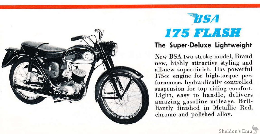 New BSA two stroke model, Brand new, highly attractive styling and all-new super-finish. Has powerful 175cc engine for high-torque performance, hydraulically controlled suspension for top riding comfort. Light, easy to handle, delivers amazing gasoline mileage.