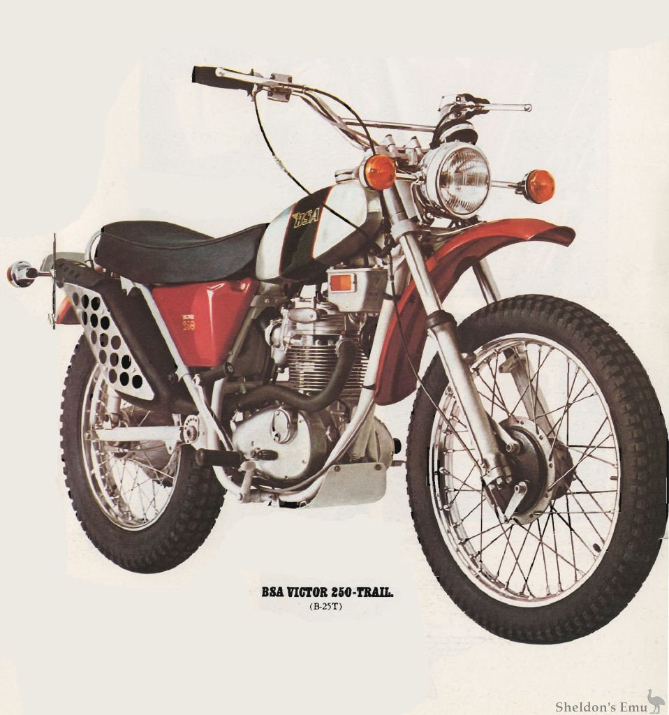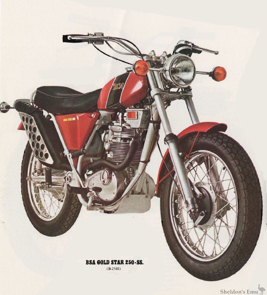 OHV 4-stroke 1 22.5 bhp @ 8250 rpm 15.8 ft. lb. @ 7000 rpm 67 x 70 mm 10:1 4-Speed gearbox Amal 28mm concentric Dunlop 3.00x20" Trials Dunlop 4.00 x 18" Trials 6" SLS 7" SLS 54" 7½ 287 lbs. 2½ gals, (aluminum tank) 4¾ pts. |
