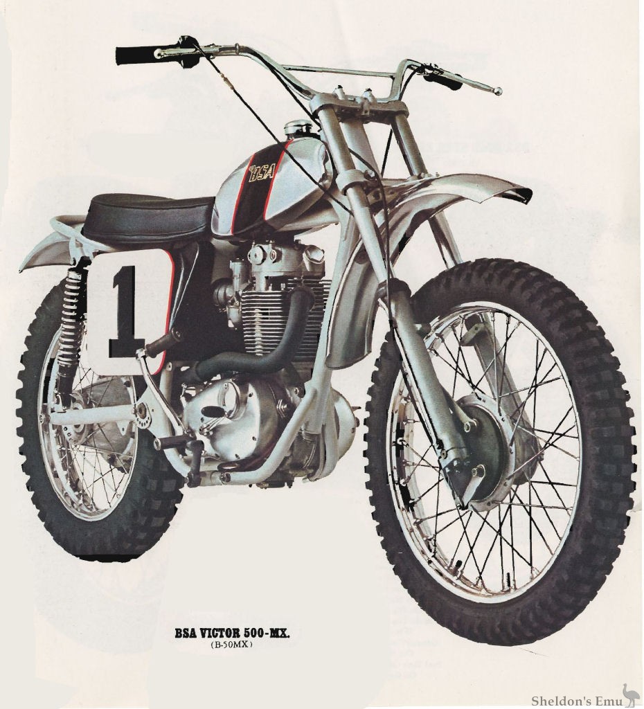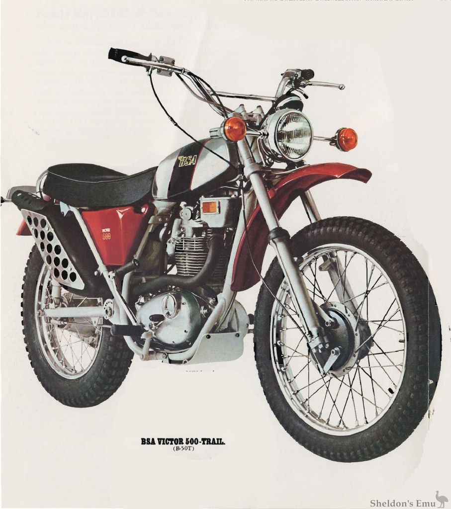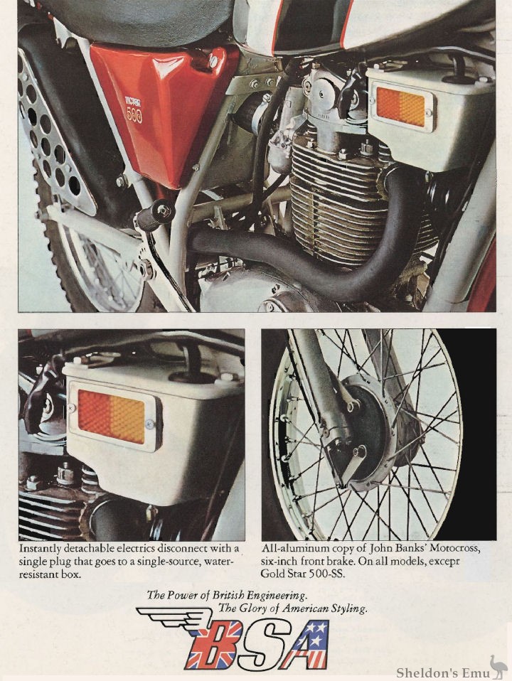 John Banks riding on BSA, twice won Britain's national Moto-X championship and he helped BSA develop the features of these bikes. We took 500 ccs of British muscle, harnessed it in a four-stroke, single cylinder engine. We teamed it with a new, lightweight racing frame - a frame that contains and cools the engine oil, and eliminates the tank. Then we added new telescopic front forks that help keep you in control on any terrain; 3-way, adjustable, Girling shocks, double-shoe brakes, to name just a few of the features that make these 1971 trail bikes Britain's best. (In fact, the worse the trail gets, the better you like BSA.)