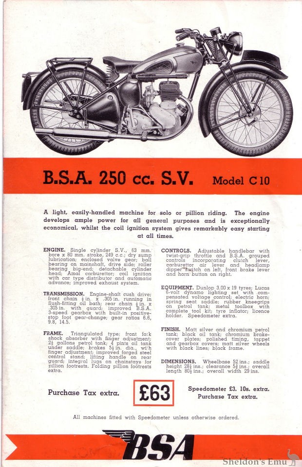 ENGINE. Single cylinder S.V., 63 mm. bore x 80 mm. stroke, 249 c.c.; dry sump lubrication; enclosed valve gear; ball bearing on mainshaft, drive side; roller bearing big-end: detachable cylinder head; Amal carburettor; coil ignition with car type distributor and automatic advance; improved exhaust system.
