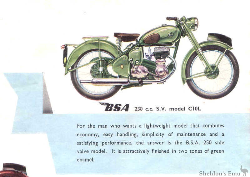 For the man who wants a lightweight model that combines economy, easy handling, simplicity of maintenance and a satisfying performance, the answer is the B.S.A. 250 side valve model. It is attractively finished in two tones of green enamel.