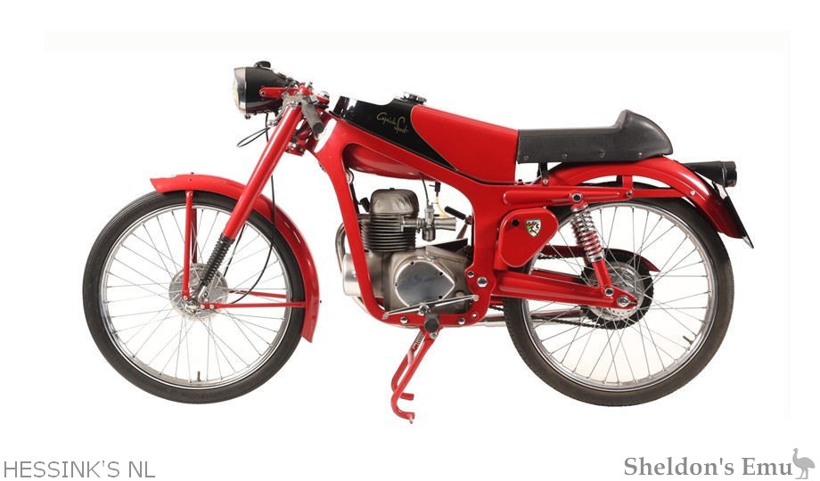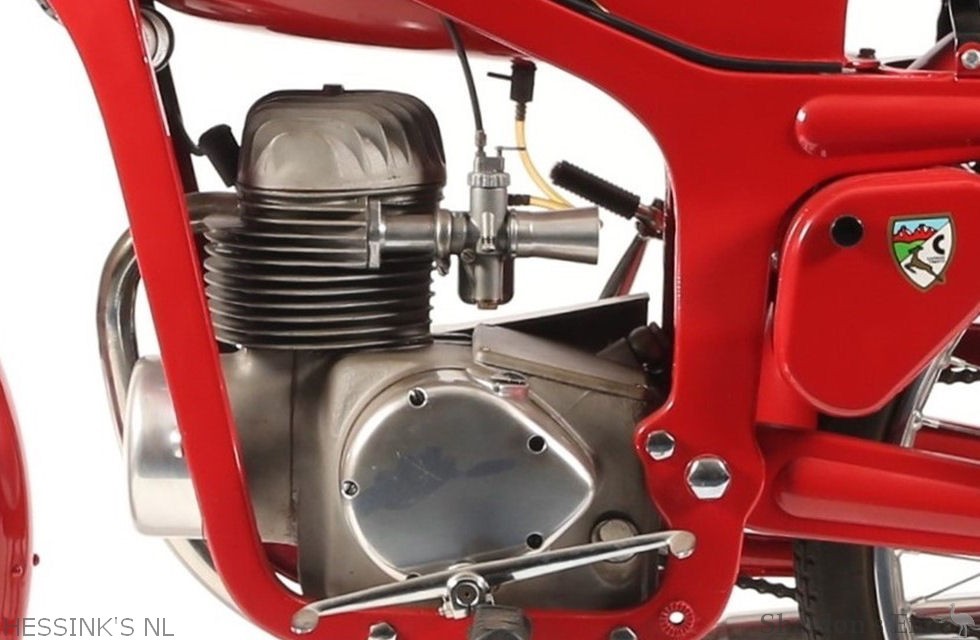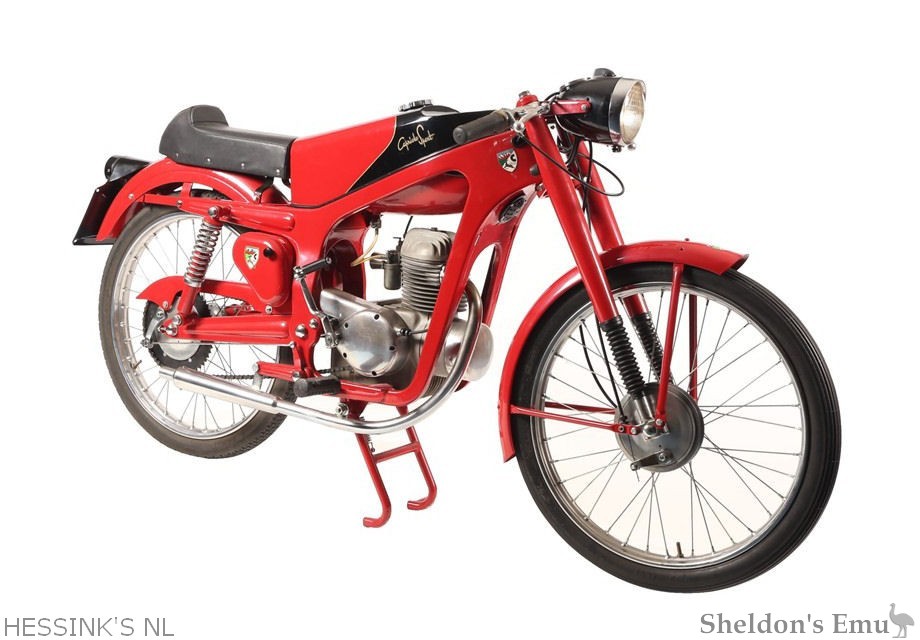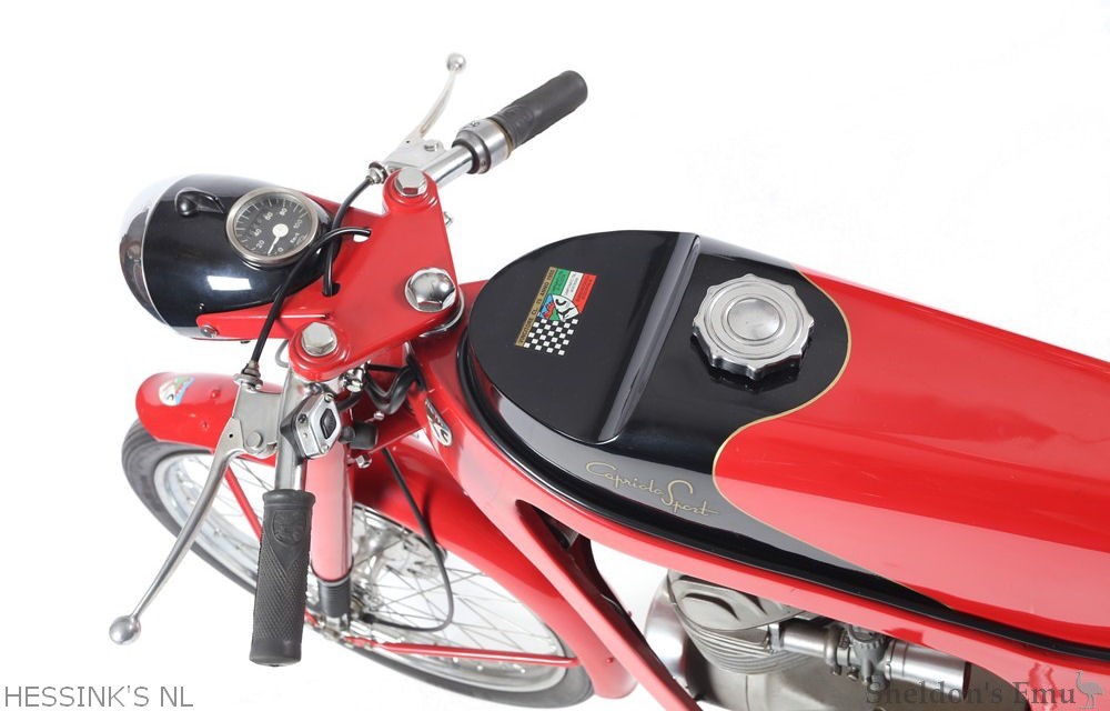 Caproni had been founded in the 1900's as an aircraft manufacturer and began motorcycle production after World War Two. One of their first models was the Capriolo 75, notable for its use of a pressed-metal frame and a 'face cam' engine, which also featured a longitudinal crankshaft, rather than the conventional transverse layout. Sports versions won their class in the 1954 Milan-Taranto and 1955 Giro Motociclistico d'Italia.