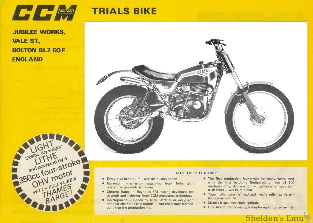 A production run of 105 units was completed and it sold so quickly, despite the hefty £1300 price tag, that Alan Clews contemplated building another batch of 100. However, with CCM motocrossers enjoying great success, he finally decided to save the parts for the more profitable motocross production. A factor in this decision was the new CCM trials project running an Italian Hiro engine which was already well underway, so the end was nigh for the fourstoke CCM making it the very desirable collectors item it is today.