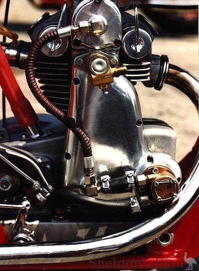 By 1954 quite a number of racing machines had been built and eventually the power output, with an 18 mm carburettor, would reach 8.5 hp at 11,000 rpm. Menti and Pietro replaced the chain-driven camshaft with a gear train, the oilpan sported cooling fins and the open hairpin valvesprings where enclosed by a case surrounding each spring valve assembly. The frame was modified several times, particularly the rear suspension.