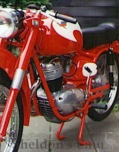 With attractive and sporty 'clean design' 125 cc engines, these included the single cradle frame 6.2 hp 'Gran Turismo' with 16 mm carburettor and the semi-double cradle framed 'Gran Turismo S' with a 7.5 hp engine and 18 mm carburettor. Also a 150 cc GTS model was created and the top model in '54 was a 175 cc chain driven OHC motorcycle of limited edition.