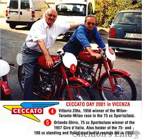 In 1954 Ghiro also broke world records on a partially streamlined 75 cc model in the 75 cc and 100 cc class on the Castelfusano circuit near Rome. On the 1 mile with flying start he clocked 134,672 km/h and also set new records for the 1 km flying start and the standing start. Supported by these successes Ceccato also added ohv four strokes to its production range.