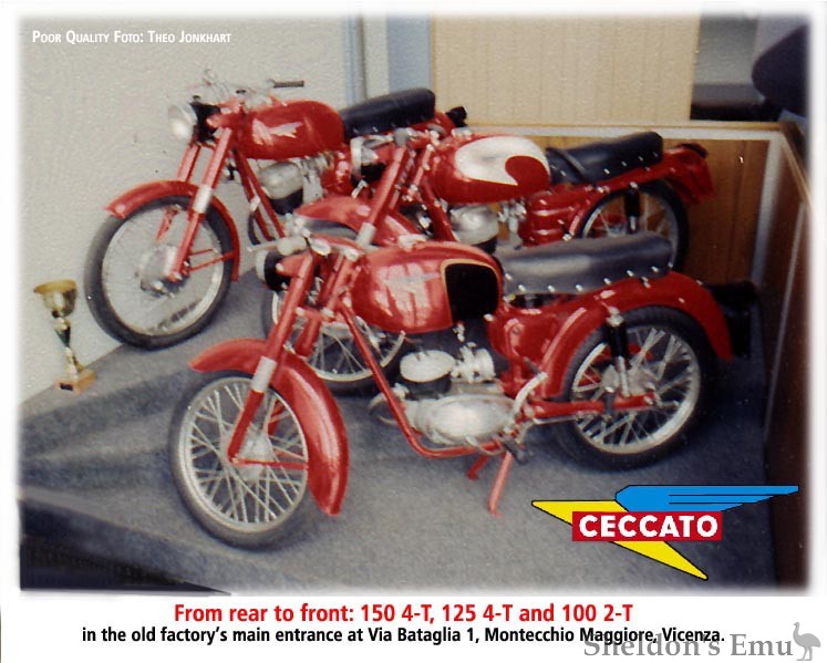 'Registro Storico Ceccato' in Brendola is the club for all Ceccatos ever produced. The 'Ceccato Day' in Montecchio Maggiore is held annually and many ex-factory riders give 'acte de presence' and hand out signatures. Giampiero Vezzaro, the club's chairman, discovered a 175 cc racer in Argentina and repatriated it to Italy. Because motorcycles were only part of a wider range of products Ceccato never had to close, unlike most of its competitors. At present the company is one of the largest producers of car and train washing machines in the world and has a global network of offices and importers. Air compressors have been produced for over sixty years.