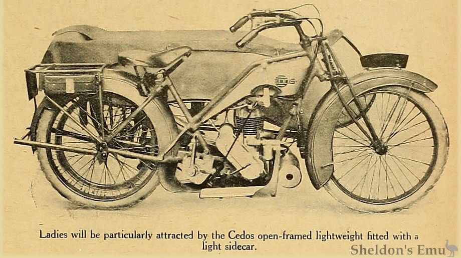 The Cedos motor cycle is full of interesting points. It has not been greatly altered since last year, but one of the modifications lies in the exhaust pipe, which is now carried underneath the engine- shield. This shield is a remarkably good feature, as it protects the engine, gear box, belt, and chain from mud thrown up by the front wheel. The manufacturers of the Cedos are also among those who specialise in a lady's machine. It is well designed, strongly constructed, and every detail is carefully thought out. The gear box is carried eccentrically in a circular bracket, so that to tighten the chain it is only necessary to alter the centre of the gear box merely by means of the adjusting screw, while there is no danger of interfering with the chain alignment. Petroil lubrication, where the lady's model is concerned, has been regarded as undesirable owing to the chances of its fair passenger soiling her attire; the makers are using a drip feed in conjunction with a hand pump.