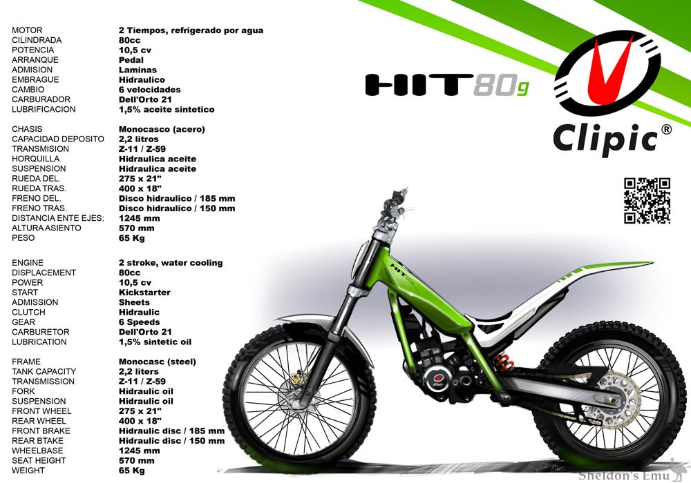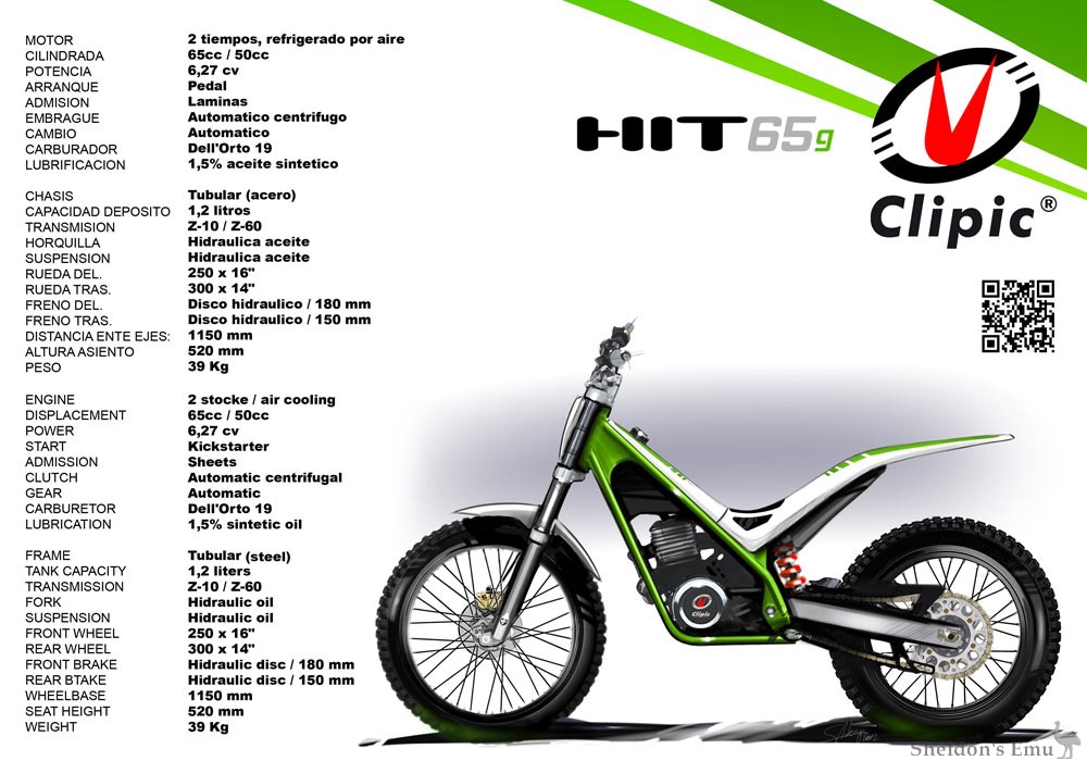 CJ50-HIT3 Competition: Franco Morini 65cc engine, 9.4 HP, automatic single speed, air cooled, Dell'Orto PHBG 19 carburetor, Champion N7 or NGK B7ES spark plug, 1.5% mixture lubrication (synthetic oil), kick starter, F/R suspension, telehydraulic fork {Paoli} / hydraulic monoshock with double arm swingarm, F/R brakes ø 180 / ø 150 mm disc, F/R 2.50 x 16" / 3.00 x 14" tyres, 1.0 Litre tank ( unleaded petrol 95) and 39 kg dry.