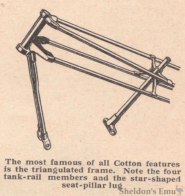 One of the most intriguing features of Cotton range is that specifications varied, within fairly wide limits, the requirements of individual As an instance, the model mentioned in this specification may be fitted with a four-speed gear box with hand control for £2 extra, or with foot control at £2 10s. extra. Further, it can be supplied with a specially tuned engine at an extra cost of £2 10s. Other modifications can be made at modest prices. The machine is equipped with dynamo lighting and electric horn.