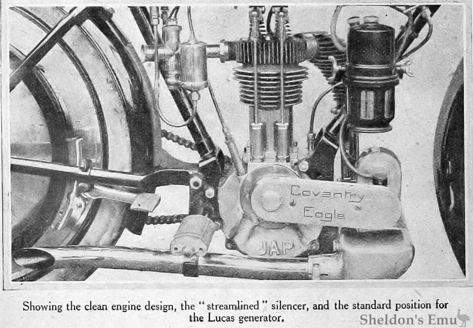 Single all-chain drive, by means of double roller Coventry chain, is employed in the present model, but it is intended to introduce a two-speed countershaft machine at once, and possibly a mode with the new lightweight Sturmey three speed box in the future.