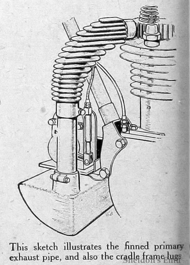 This sketch illustrates the finned primary exhaust pipe, and also the cradle frame lugs.