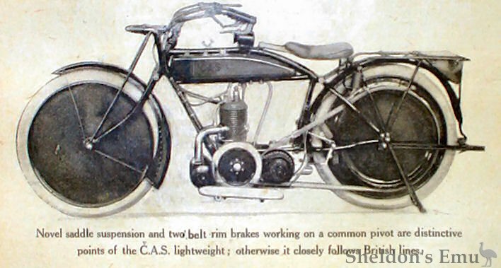Novel saddle suspension and two belt rim brakes working on a common pivot are distinctive points of the C.A.S. lightweight; otherwise it closely follows British lines.