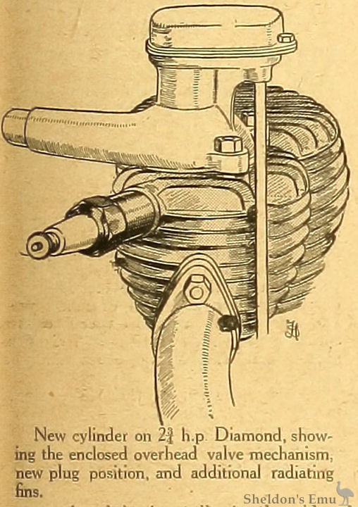 The sporting type has a somewhat altered cylinder, vertical ribs being cast at an angle across the head. The sparking plug is now placed horizontally in the side of the valve chamber, and the inlet pipe is curved away so as to be well clear of the frame, and to allow easy access to the valve. The bore and stroke of the engine are 75 x 70 mm. Both inlet and exhaust valves provide a clear port of 1¾ in diameter.