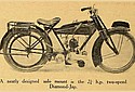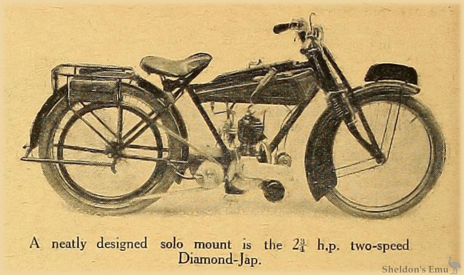 Amongst the firms who distinguished themselves just prior to the Show by setting up new records at Brooklands are the D.F. and M. Engineering Co., whose beautifully finished little J.A.P.-engined lightweight forms a centre of attraction. Model K embodies a J.A.P. engine and Enfield two-speed gear, yet; though the specification appears ordinary, there are many little details which distinguish the Diamond range from the average machine. A simple frame construction with straight sloping top tube gives a pleasing appearance, and duplex front down tubes are a well-known Diamond feature. These tubes are detachable, as also is the lower tank rail on which the tank is supported. A most ingenious feature is the method of fixing the Enfield countershaft gear. The gear is carried in an aluminium casting, which bolts up to a bracket suitable also for a standard countershaft gear. Both primary chains and the selective clutches are entirely enclosed in an aluminium case, the top half of which is easily detachable, though great care has been taken to render the joint oil-tight. A simple heel brake and excellent mudguards complete the specification. The same machine can be obtained with Sturmey-Archer two-speed gear. Price so fitted is £89 10s. Three other similar mounts are staged, fitted with Villiers flywheel magneto engine; these are also fitted with Enfield or Sturmey-Archer gear, or may be obtained with direct belt drive at the figure of £61 19s. 168 lb. is the weight of the heaviest machine made by the firm.