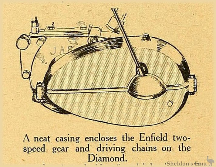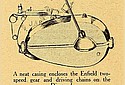 2½ h.p.; 70x76 mm. (293 c.c); single-cylinder four-stroke; side-by-side valves; drip feed lubrication; Amac carburetter; C.A.V. chain-driven magneto; two-speed Enfield gear; chain and belt drive; Dunlop 26x2½ in. tyres. Price £84.