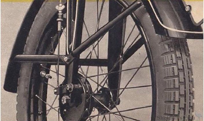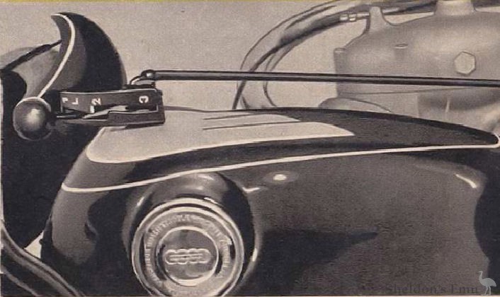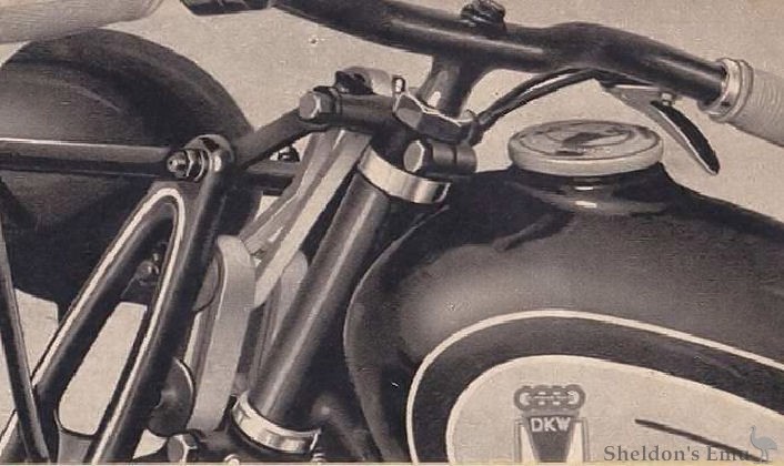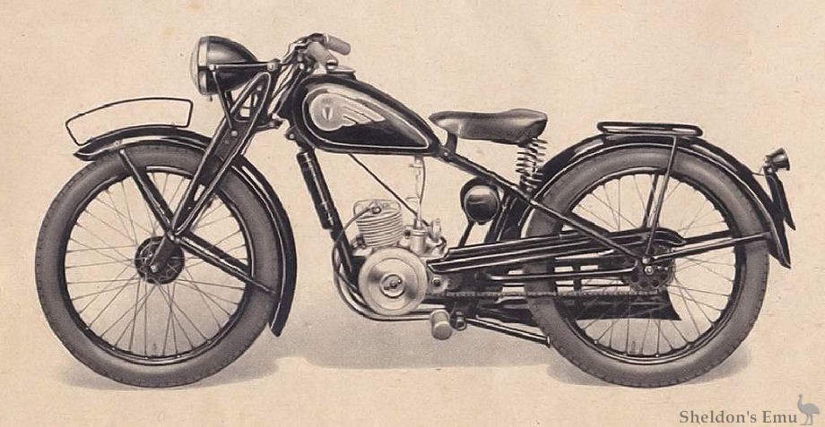 RT100 "De Luxe" The smallest and at once the most popular machine of the DKW line is the RT 100. Day after day its owner derives new pleasure from the unusual performance of the engine which - built in one unit with the three speed gear box - enables this light machine to attain the amazing top speed of 43 m.p.h. And yet this machine is extremely economical in fuel consumption, travelling 140 miles on one gallon, and handles as easily as a cycle.