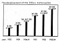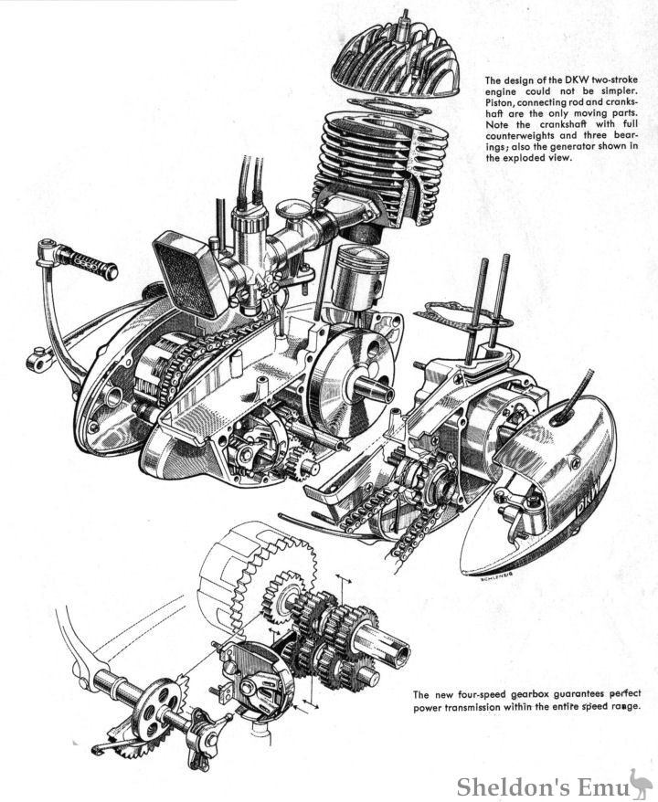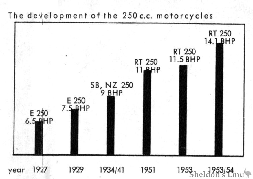 Looking back to-day on the development since 1927 one can clearly see two vitally important factors: Firstly, the traditional principle to build slow-revving, economical and sturdy DKW two-stroke engines, and secondly, the endeavour steadily to increase the performance and the speed of the machines.