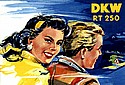 The 4-speed gearbox is exactly tuned in its gear ratios to the engine performance. If meets all practical demands and enables - together with the "over-revving" capacity of the DKW two-stroke engine - astonishingly high cruising speeds. For example one can accelerate with perfect ease up to 18.6 m.p.h., in 1st gear, in the second up to nearly 37.3 m.p.h, and in the third even up to 49.7 m.p.h., and can then shift in to fourth without any noticeable reduction in speed. From a standing start the machine accelerates up to 56 m.p.h, in only 18 seconds, the maximum being 71 m.p.h. Naturally the new RT 250 is especially suitable for sidecar use. This is made possible by 14.1 BHP, the sidecar-tuned suspension, the closed, rigid steel tube frame and the excellently graduated gearbox. But seemingly small details have also been considered on the new DKW: The exhaust pipe is placed on the left-hand side so as to remove it as far as possible from the sidecar, an advantage which the sidecar passenger will gratefully appreciate. The description of this new DKW would, however, be incomplete if we failed to refer to the legendary economy of all DKW motorcycles, a feature which has been proved by hundreds of thousands of machines all over the world. It was also a fundamental principle, when designing the new RT 250, to build a machine that could be maintained by motorcycle enthusiasts of the most moderate means. So much for the technical qualities of the RT 250. Two other features however, should not be forgotten: The smart appearance due to the elegant flowing lines and the remarkable silence of the machine which is scarcely louder than that of a motorcar. Such advantages will always find the convinced approval of all motorcycle enthusiasts, and last but not least, also that of his passenger.