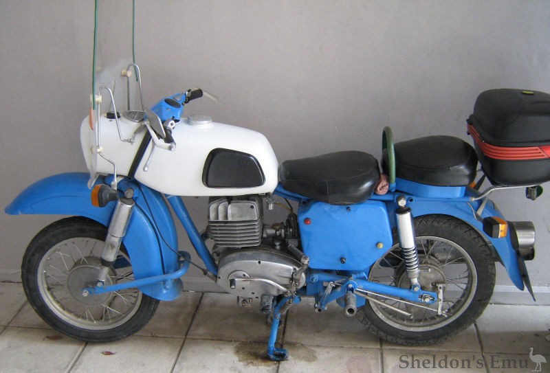 their contemporary, the Jawa Californians. Mz is lighter, about as fast as a Jawa 350 twin, and corners and stops better, although this may be faint praise.