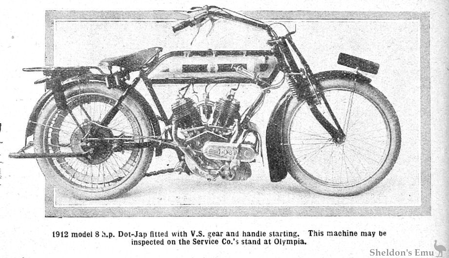 Two examples of the Dot motor cycles, which hail from Manchester. Both complete machines on the stand are fitted with 5 1/2 h.p. twin-cylinder Peugeot engines. Brown and Barlow carburetter, and belt transmission. The frames are unusually low, well under 30in. from top of saddle to the ground. The tanks are circular with a torpedo front, and the complete machines look very smart indeed, although occupying rather a bad position in the Arcade entrance, where prospective buyers are not tempted to linger in the somewhat strong air currents prevalent in this portion of the building.
