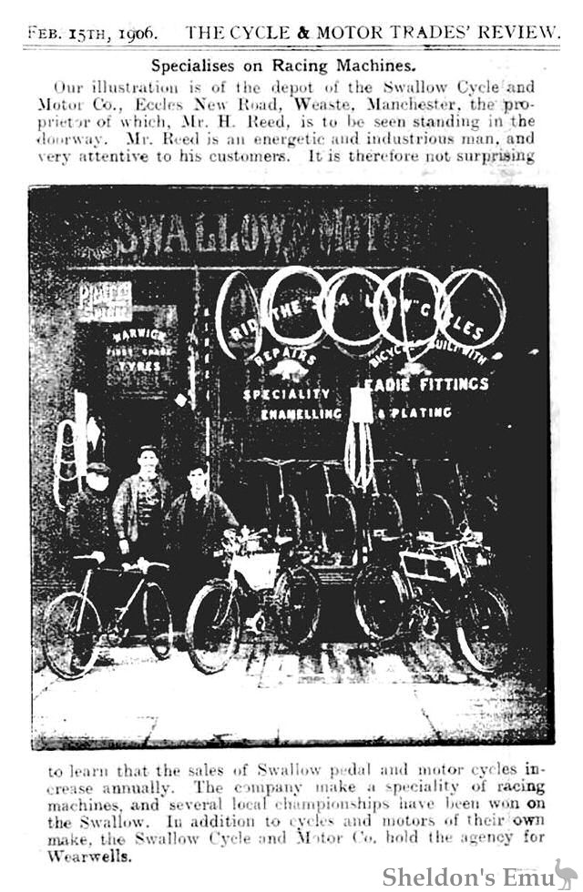 Our illustration is of the depot of the Swallow Cycle and Motor Co., Eccles Road, Weaste, Manchester. the proprieter of which, Mr. H. Reed, is to be seen standing in the doorway. Mr. Reed is an energetic and industrious man, and very attentive to his customers.