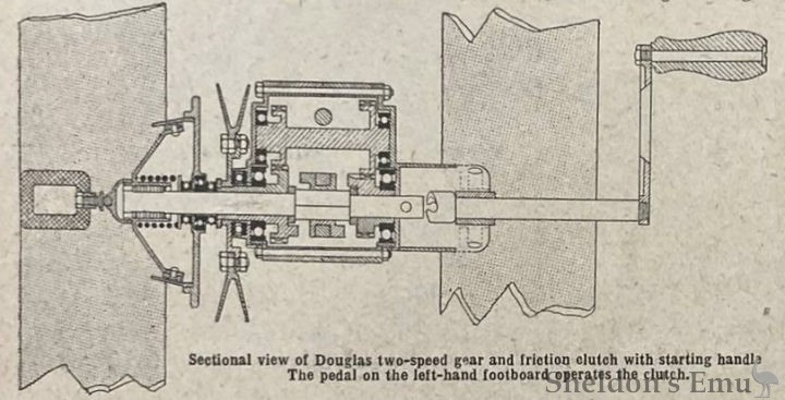Sectional view of Douglas two-speed gear and friction clutch with starting handle. The pedal on the left-hand footboard operates the clutch.