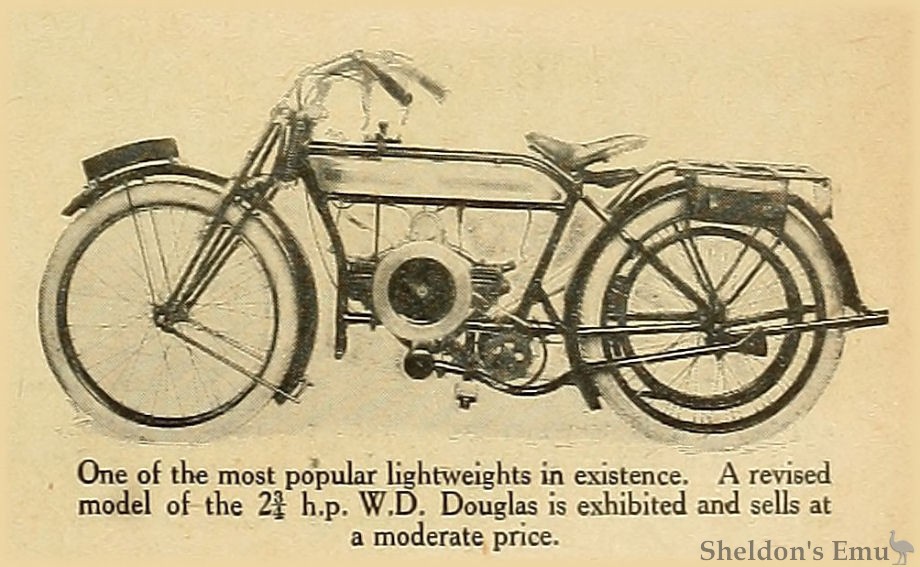 The 4 h.p. Douglas remains practically unaltered, for the experience gained during the war under extremely unfavourable conditions has made the machine entirely satisfactory in its present form. Details of the 2¾ h.p. Douglas are so well known that they need not be repeated here. Besides supplying the three-speed kick-starter model, which is priced at £105, the makers are listing an improved W.D. model with plain two-speed gear at £85.