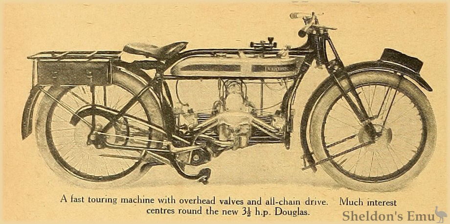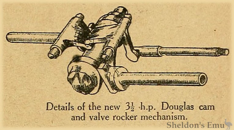 The new Douglas sporting engine has already been described in our columns. Only in its main lines does it follow existing Douglas practice. The valve gear is quite new. Both cylinder heads are detachable, and above the valve rocker bearings (which form part of the casting), there is a small ribbed aluminium chamber, which is filled with oil about every thousand miles, and lubricates the valve rockers by a wick feed. Engine lubrication is also new; a worm-driven pump on the top of the crank case draws oil from the tank and forces it through a sight feed to two pipes which lead into the base of each cylinder. In addition to this, a hand pump is provided by which charges of fresh cool oil can be applied just above the moving cranks in case of necessity.