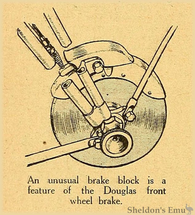 A new front brake is also fitted, which takes the form of a bevel edge disc of about 6in. diameter on the hub, with a parallel motion V grooved shoe embracing about one-third of its circumference. Altogether, it is a most interesting machine.