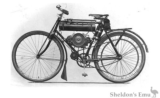 The machine had a 2.5hp flat-twin engine fitted high in a stock bicycle frame, with transmission by chain to a counter-shaft and clutch, then by belt to the rear wheel.