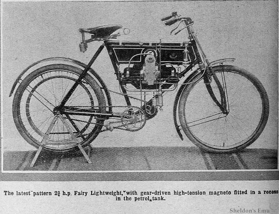 "The Fairy is the highest powered lightweight in the show, viz., 3 h.p. at 80 lbs. twin cylinders, horizontally opposed, with Simms-Bosch magneto. This machine also attains its gear reduction safely, as the engine drives a counter-shaft fixed in bearings at the bottom angle of the diamond frame by means of a chain, the drive being continued by belt. This machine is specially smooth running, and its carburetter is a sound device, with detachable jet."
