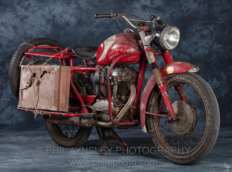 (who later founded Italjet) and Giorgio Monetti left Bologna on a pair of the newly announced 175T models (standard apart from the rear luggage racks). In 12 months they rode around the world providing excellent publicity for the company, which followed up by establishing sales outlets in many of the countries they passed through. The pair returned in triumph to Bologna on 5th September 1958, just in time to celebrate Ducati's filling the first five places at the Italian GP at Monza that day. Remarkably the bikes are still in the condition they finished the trip in!