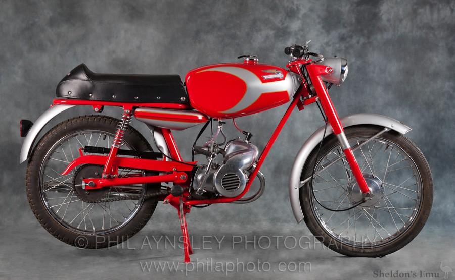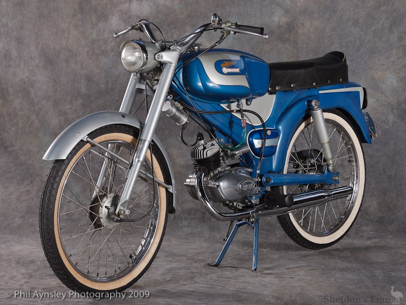 A Sport model without pedals joined the range in 1962 which had the 12 litre "jellymould" tank mounted between the tank and the seat, giving it the appearance of a motorcycle. It weighed 49kg and could achieve 80kph in unrestricted form. Performance had been improved with the aid of a downdraught carburettor.