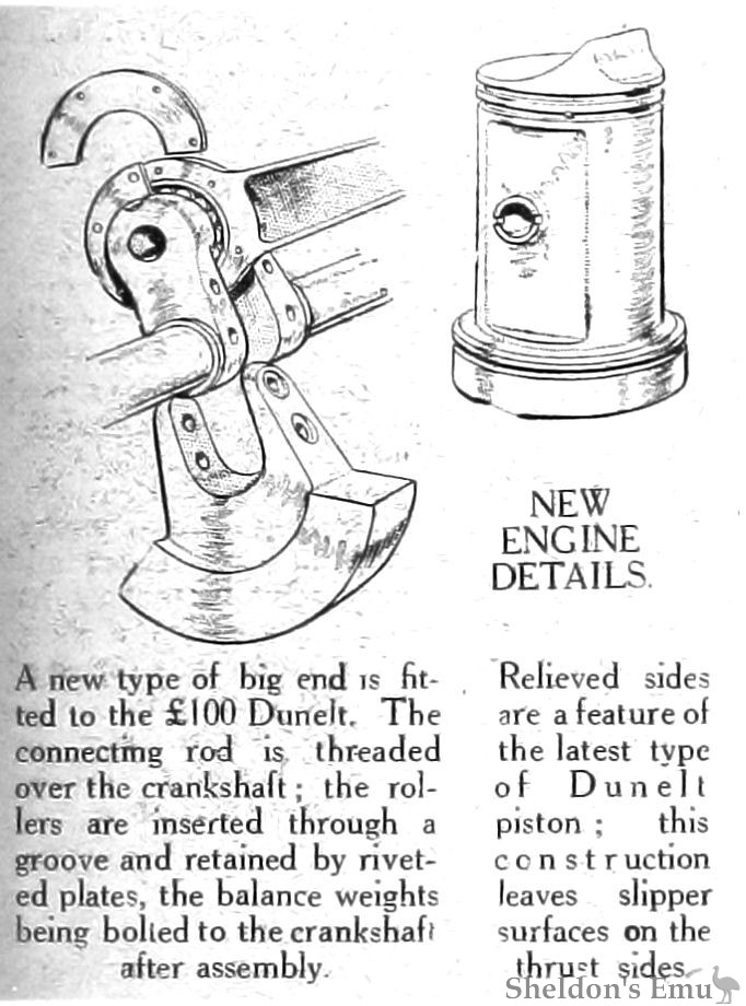 L. A new type of big end is fitted lo the £100 Dunelt. The connecting rod is. threaded over the crankshaft; the rollers are inserted through a groove and retained by riveted plates, the balance