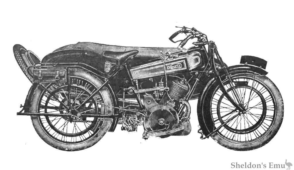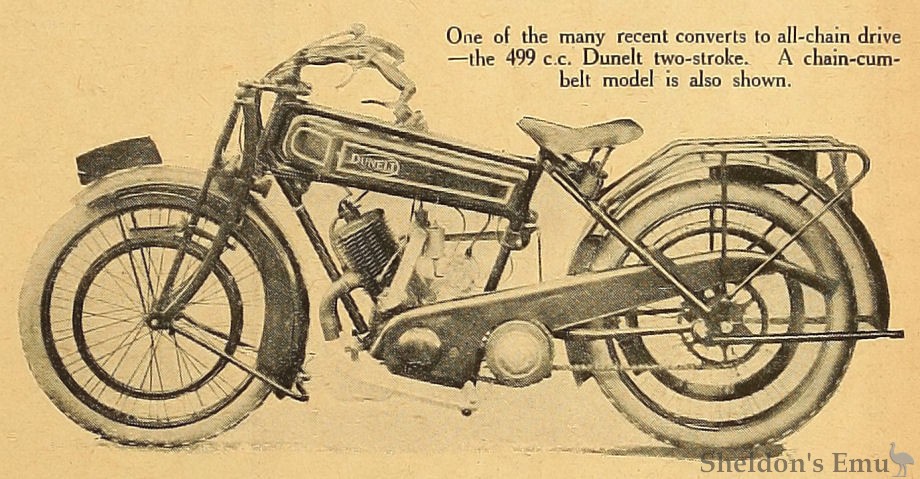 The Dunelt is the only big single-cylinder machine which employs a two-stroke engine, and even in the two-stroke world it is distinctive because it has a double diameter piston. The cylinder is placed at an angle, thus allowing the tank to slope to a lower point at the rear, and also bringing the saddle position lower. One solo machine is shown of touring type with handlebars of black finish, wide mudguards, and the tools in their leather case protected by a metal strengthening box. The other three examples on the stand all have sidecars, and beyond this addition do not differ from the solo mount to any extent. One is shown completely equipped with a celluloid windscreen of large size clipped to the handle-bars, which should be remarkably effective, extra leg guards for the rider, a shield for the sidecar, and a gear-driven speedometer bolted to the handlebars. Two of the sidecar machines, however, have final belt drive, and one has an all-chain transmission; with sidecar it is listed at the very reasonable price of £95.