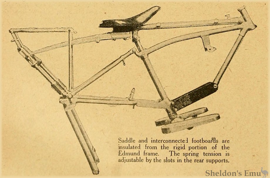 Both front and rear springing on the Edmund is now very advanced for a lightweight machine. The rear system of springing is no new untried device; but, for the benefit, of those who are newcomers to the pastime, we will recapitulate. Briefly, the top tube, to which is attached the petrol tank, is pivoted at its forward end. Linked to the rear end is the saddle tube, which slides in the outer rear main tube in phosphor bronze bushes, and to which, at its lower end, are fixed the footrests. This movement is controlled by two stiff leaf springs attached to special rear carrier stays. With these stays are incorporated two auxiliary coil springs which are instantly adjustable in tension. Thus, in effect, only the rider and the tank are insulated, and, therefore, belt tension does not vary. The front forks utilise parallel motion links of the usual type, but the spring is a vertical laminated one. The friction generated by this spring against the upper shackle pin effectively damps all rebound.