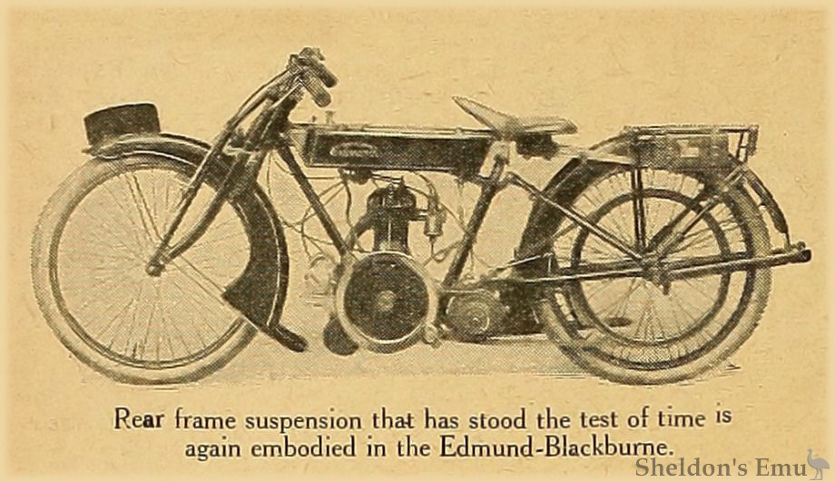 2¾ h.p. Blackburne; 71x88 mm. (349 c.c); single-cylinder four-stroke; side-by-side valves; drip feed lubrication; Amac carburetter; E.I.C. chain-driven magneto; two-speed Burman gear; chain and belt drive; Dunlop 26x2 ¼ in. tyres. Price £105.