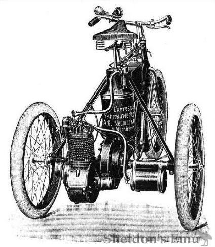 Express Werke of Newmarkt, a bicycle manufacturer since 1897 which began as Goldschmidt & Co., built Fafnir-engined motorcycles in the early nineteen hundreds until 1907, then in 1930 resumed production with lightweight motorcycles using 75cc F&S engines, and in 1935 the models K 100 and K 120 appeared. Three-wheelers powered by French engines were also built during this period. Production continued until the onset of the second war, during which their efforts were focused on supplying the armed forces with motorised bicycles.