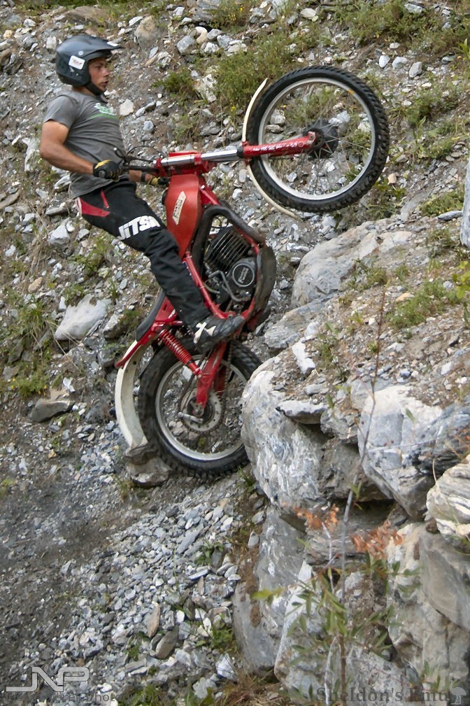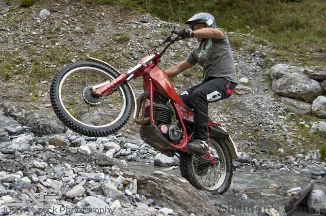 My first impression was how light the bike is! Certainly this is a characteristic of all successful competition trials Fantics, but in this case aided by the fact that it began as a 125, upped to 156, 212 and finally to 249cc. This lightness changed the way trials machines were ridden, introduced by the style of Thierry Michaud and Jordi Tarres, so I also tried "surplaces"[1] as well as hopping it sideways - rather good fun on this one. It actually feels rather like a modern mount, but of course with limitations due to its vintage. I was soon comfortable with the handling and riding position, which were just perfect for me. It has excellent brakes and suspension allowing almost effortless clearing of obstacles, always with full control, although I did need to adapt to the higher revs required... initially I stalled the engine a few times, but soon got the knack.