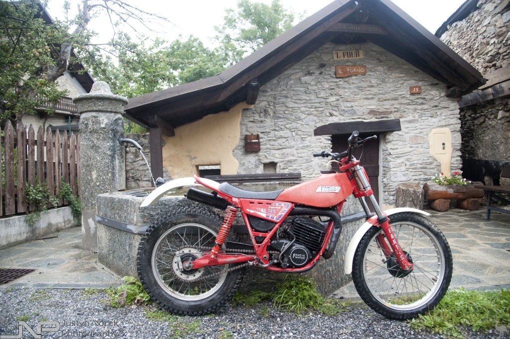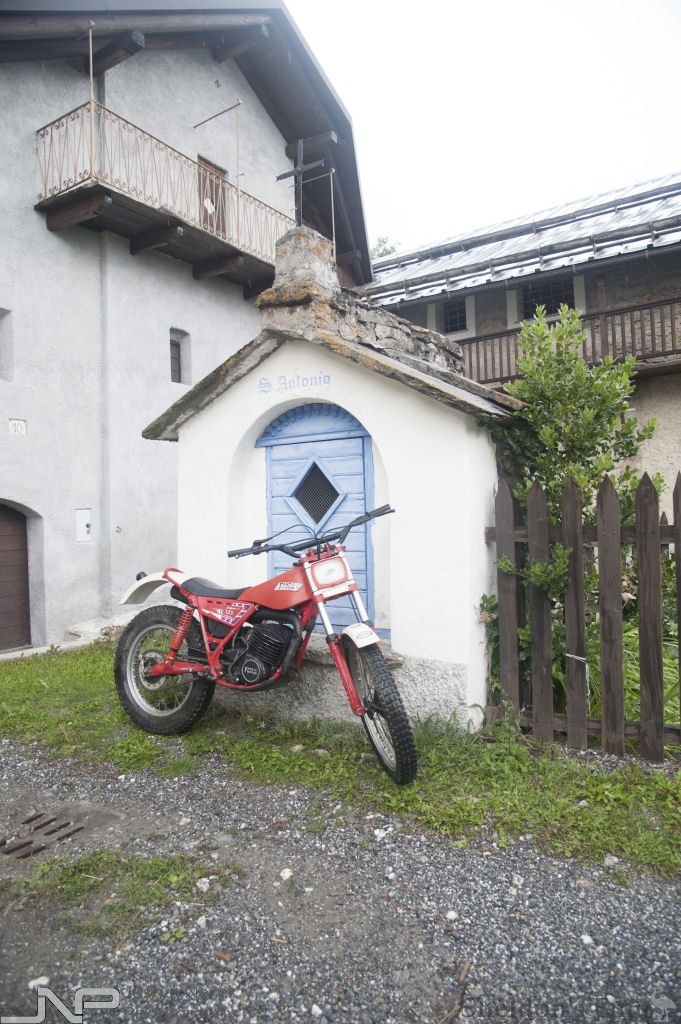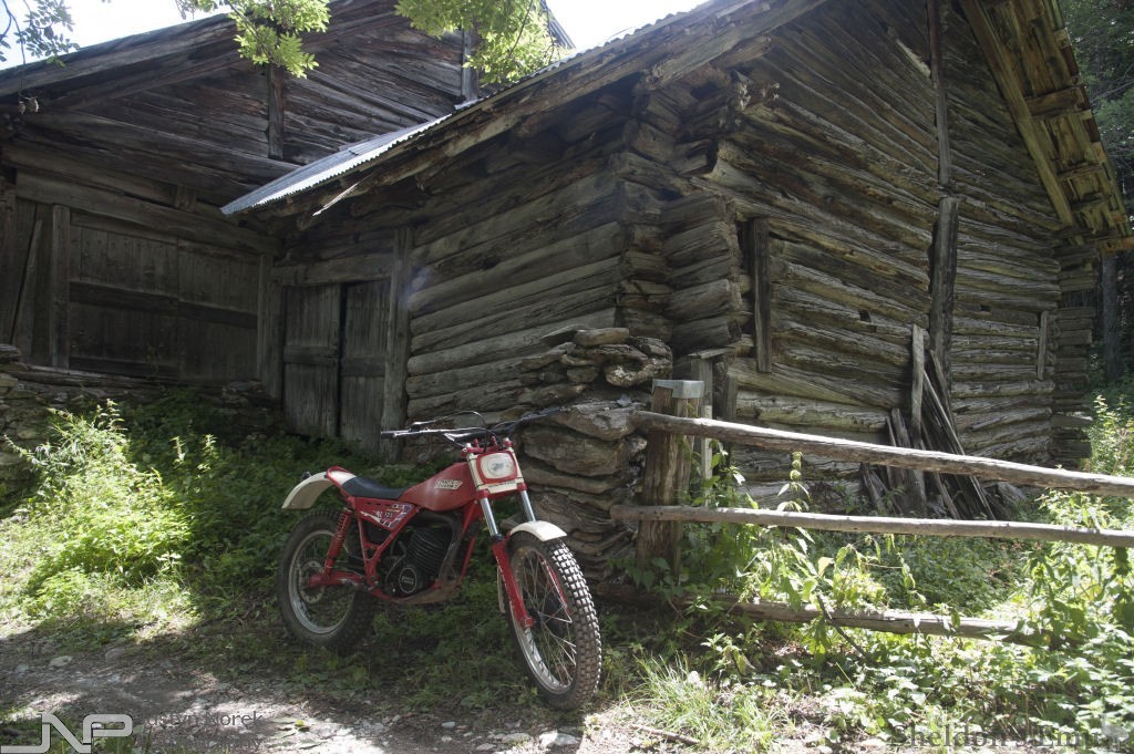 When I asked my friend Carlo Ramella what trials bikes from his collection we will test this summer, he has proposed Fantic 125 ex works bike of late top Italian trials rider of 80s Diego Bosis, Cotton-Minarelli 175 and Mecatecno 350 ex-works bike of Juventany. A tough choice, but I settled on the Fantic. We came to Carlo's mountain house early on Sunday morning in the middle of a hot August. Carlo and Pippo (Bartorilla) were already waiting for us with the bike perfectly clean and awaiting a photo session. Without adieu we took the machine to a variety of attractive locations.